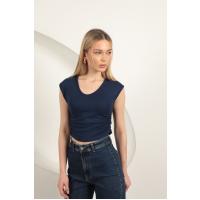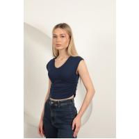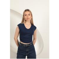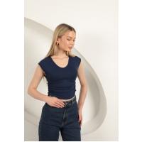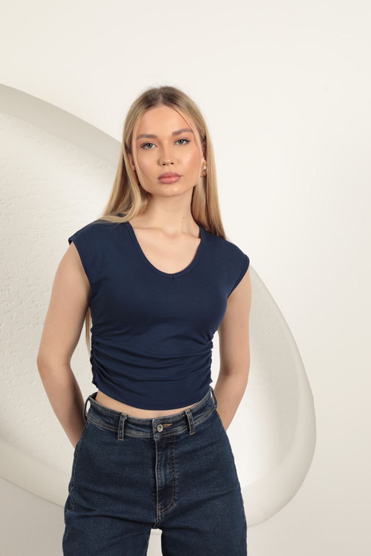Çilek Viskon Kumaş Yanları Büzgülü Bluz-Lacivert