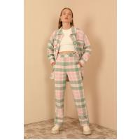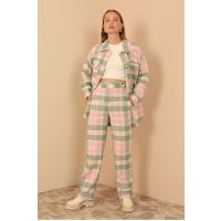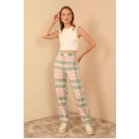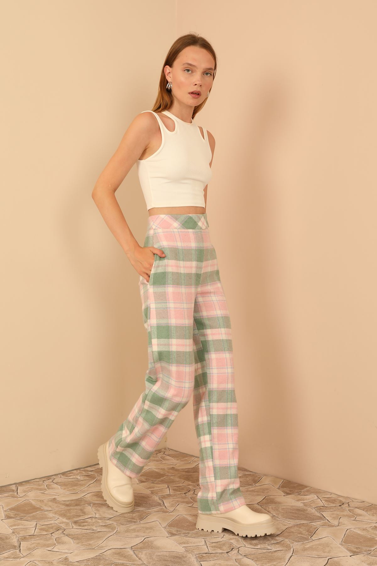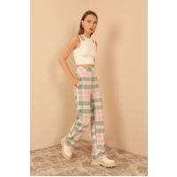 Ekose Kumaş Rahat Kalıp Kadın Pantolon-Pembe