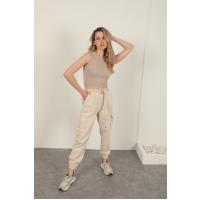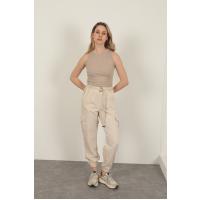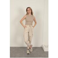 Gabardin Kumaş Kemerli Kargo Kadın Pantolon-Bej