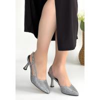 Joga Gümüş Saten Simli Topuklu Ayakkabı