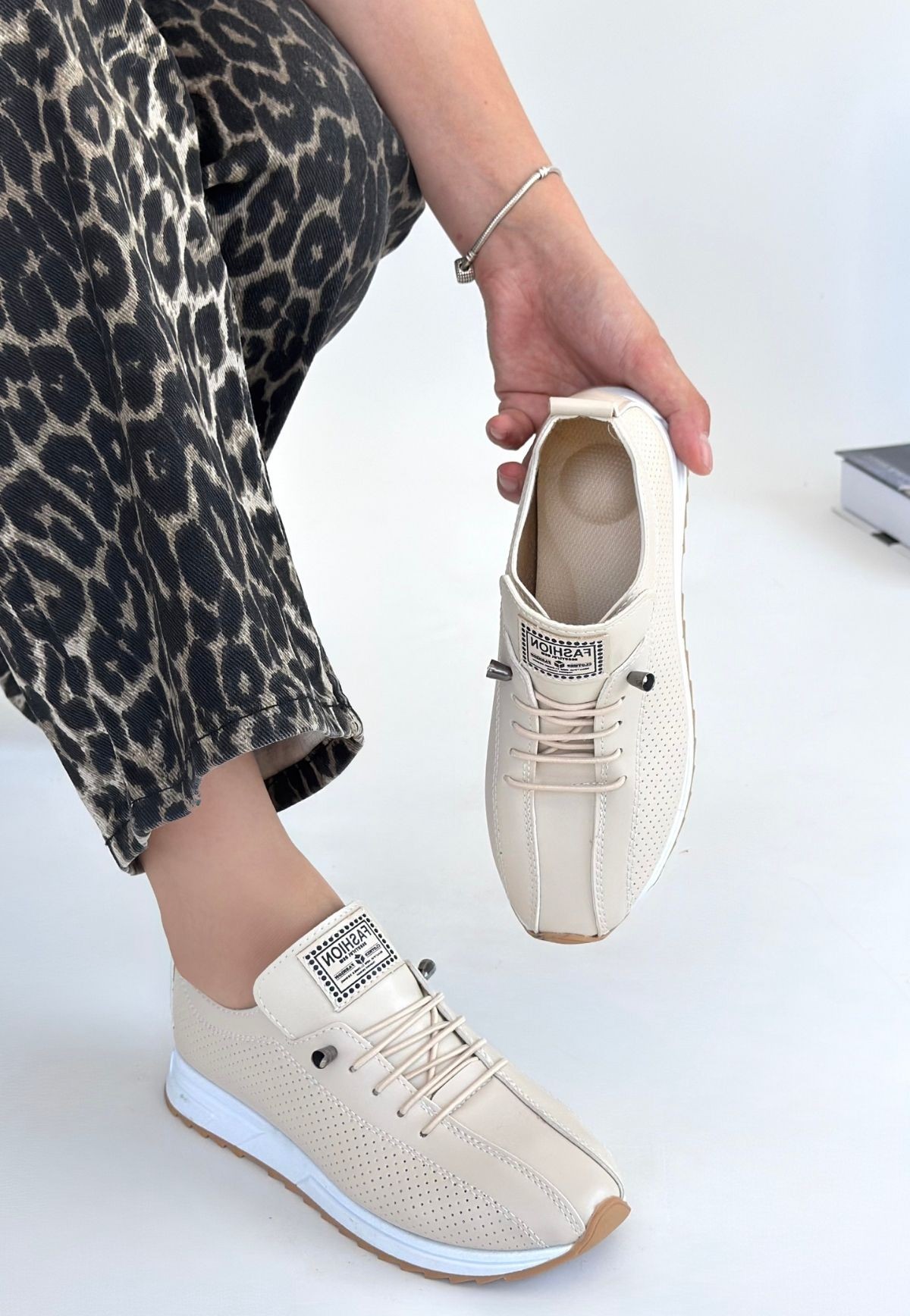 Rimay Beyaz Cilt Boncuk İşlemeli Spor Ayakkabı