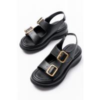 Kaji Siyah Cilt Çift Tokalı Sandalet