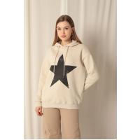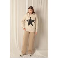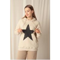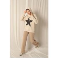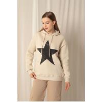 Üç İplik Yıldız Baskılı Kapüşonlu Kadın Bej Sweat